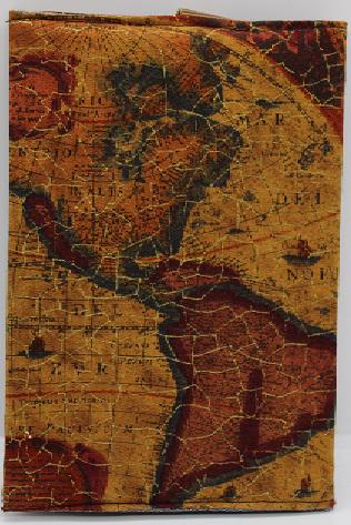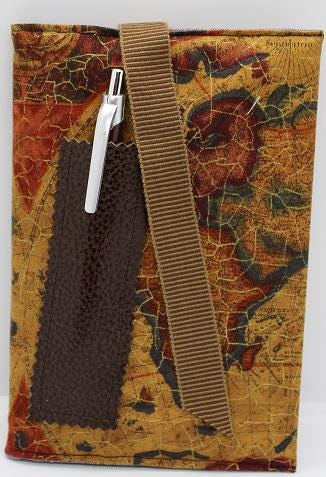 Fabric Covered Journal in Ancient Map print. It has a removable cover and an attached ribbon to use as a bookmark. The front has a leather pocket holding a pen. There are 60 lined pages for you to write to your heart's content. The cover is lined with gray cotton fabric.