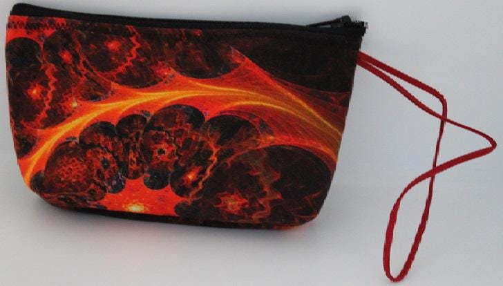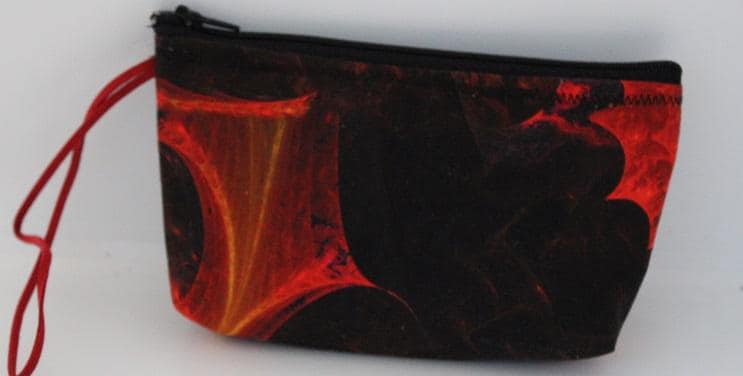 Carry this purse on your wrist and keep your hands free. It can hold a small cellphone, keys,money, cards, make-up or other essentials. It closes with a black sipper and is fully lined with orange satin. The strap is rust suede.
