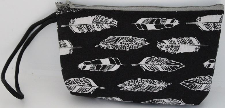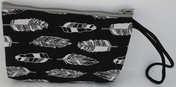 Carry this purse on your wrist keeping your hands free. It can hold a small cellphone, keys, make-up, money, cards or other essentials. It closes with a gray zipper and has a black and white cotton lining. The strap is black cording.