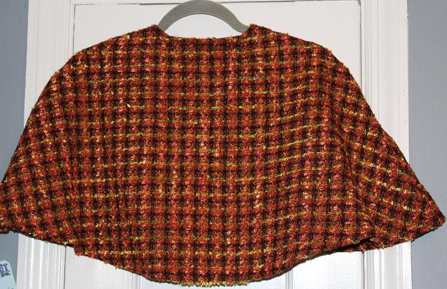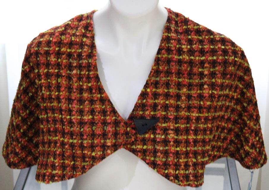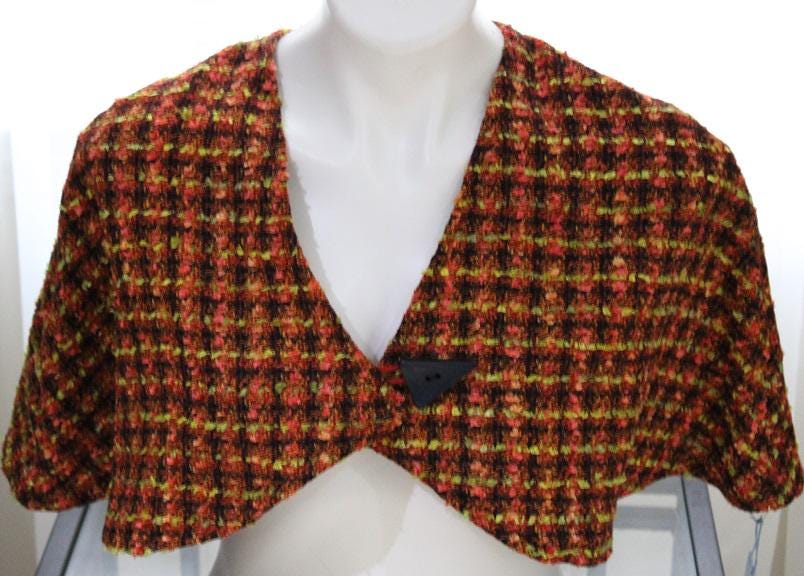 Rust Capelet is just a little something to wear on a cool day.....over your dress, top,coat. It is one size, in a textured fabric with the colors : rust, black, lime. This Capelet closes with a loop and Black triangular shaped button.