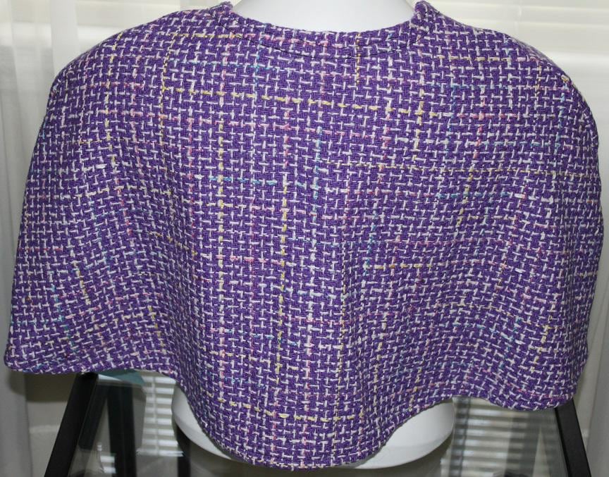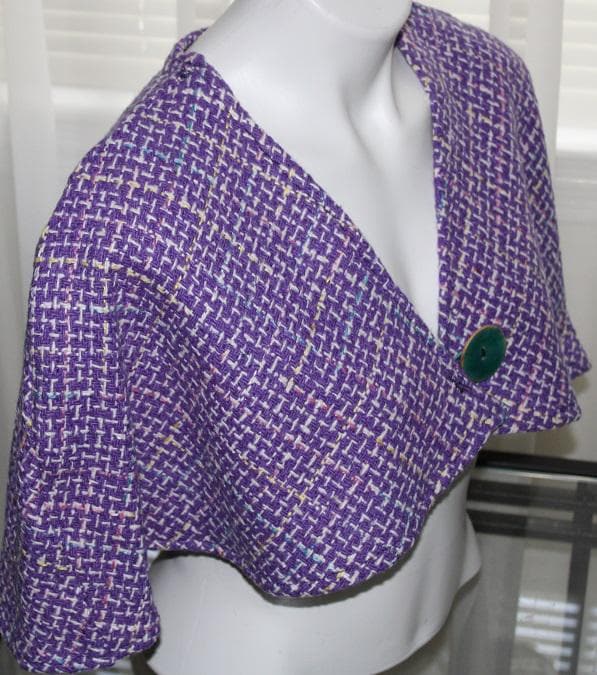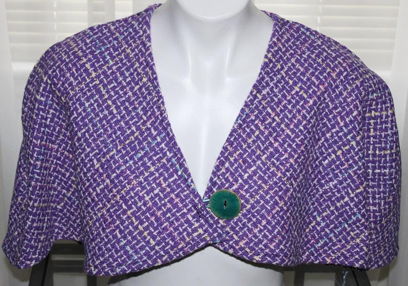 Purple Wool Tweed Capelet closes with a loop and Blue Button. Just a little something to wear over your dress, top or coat, on an evening out, casually with jeans, or to keep your shoulders warm.