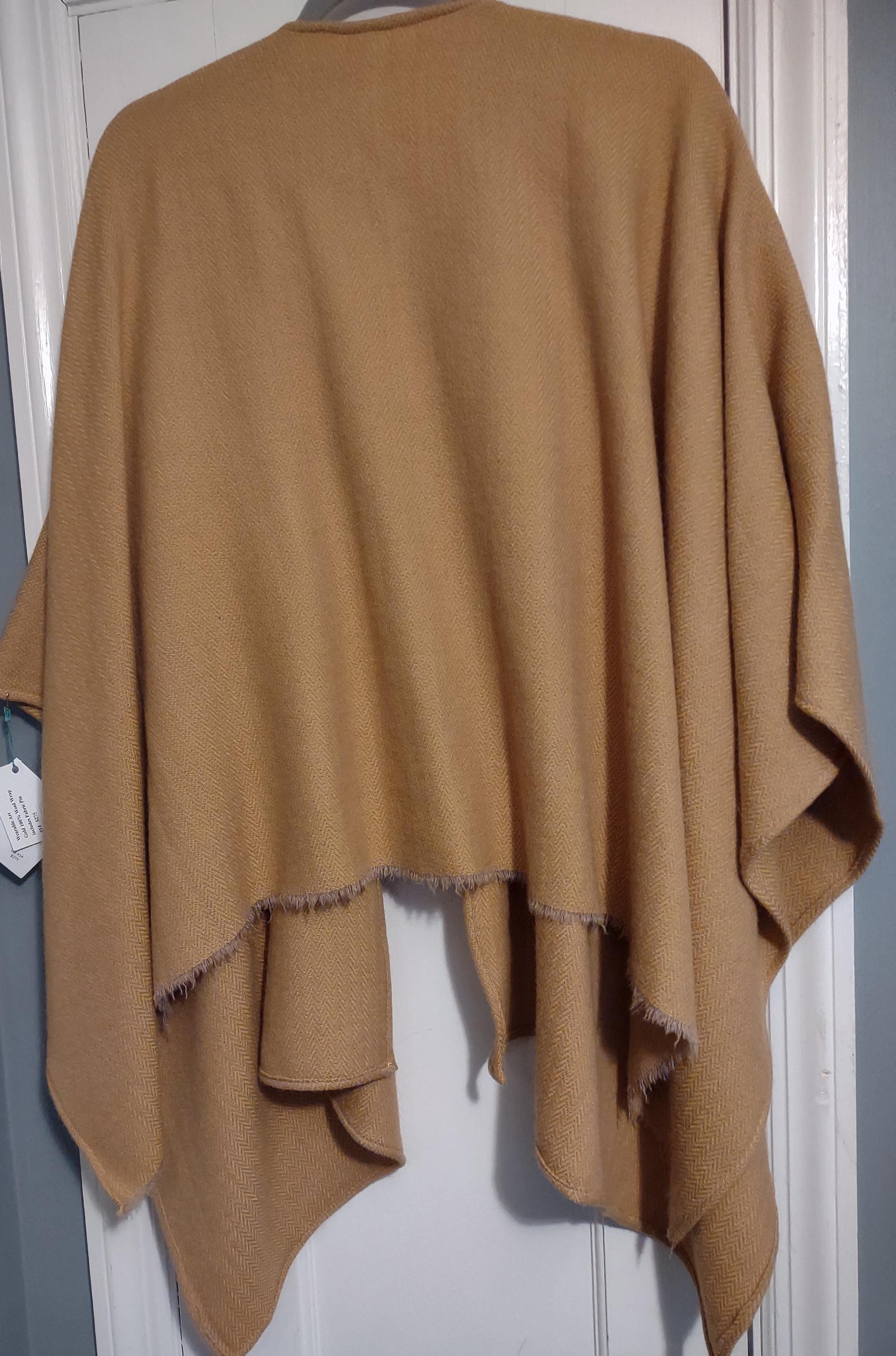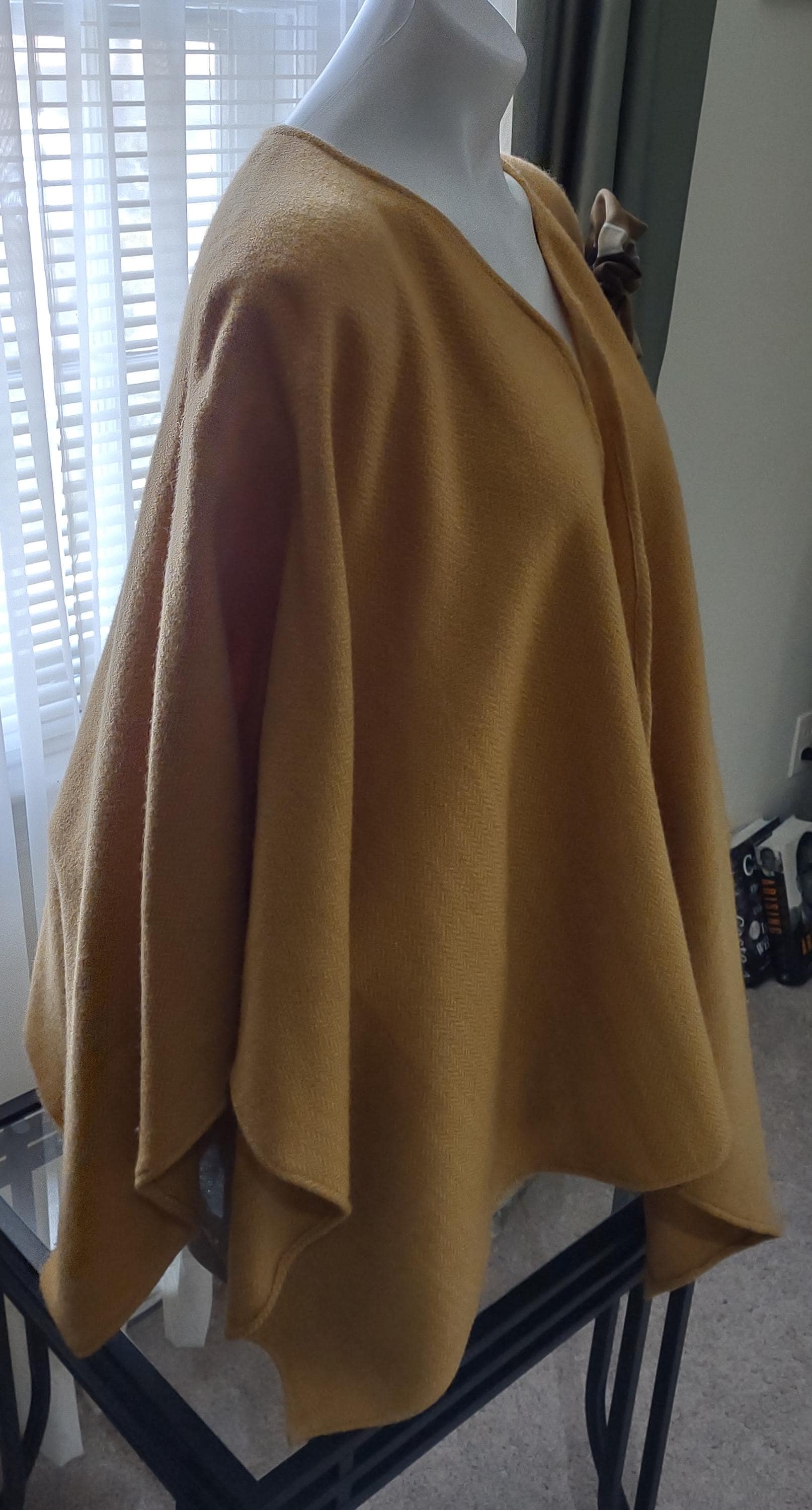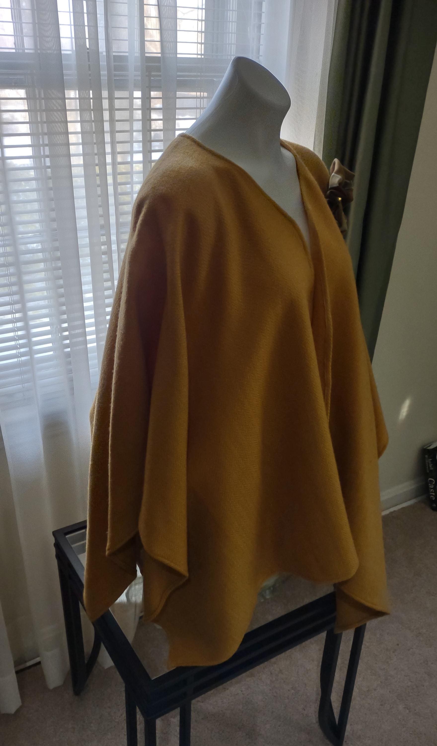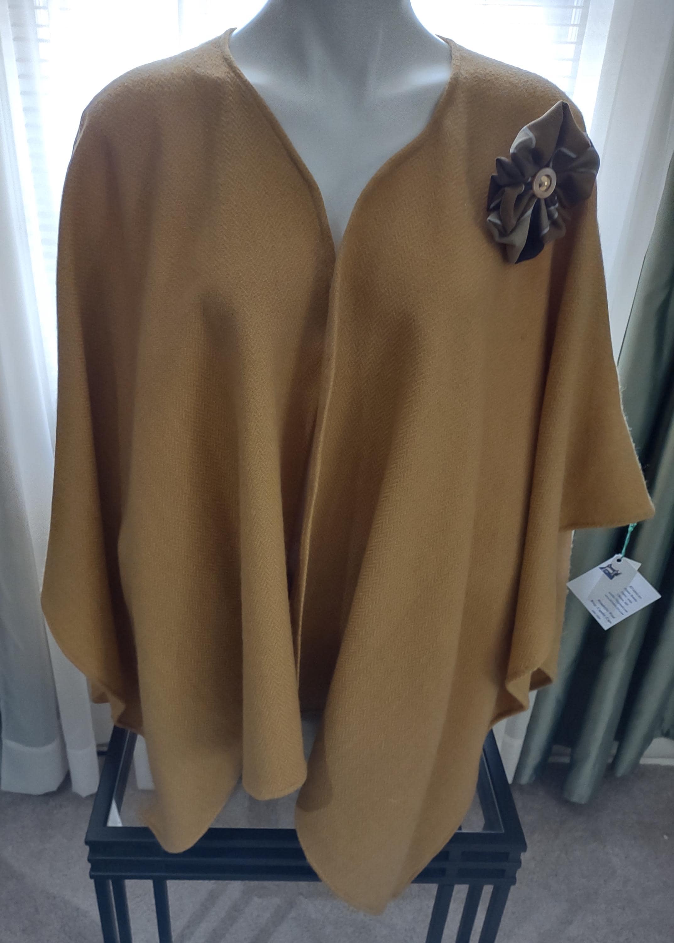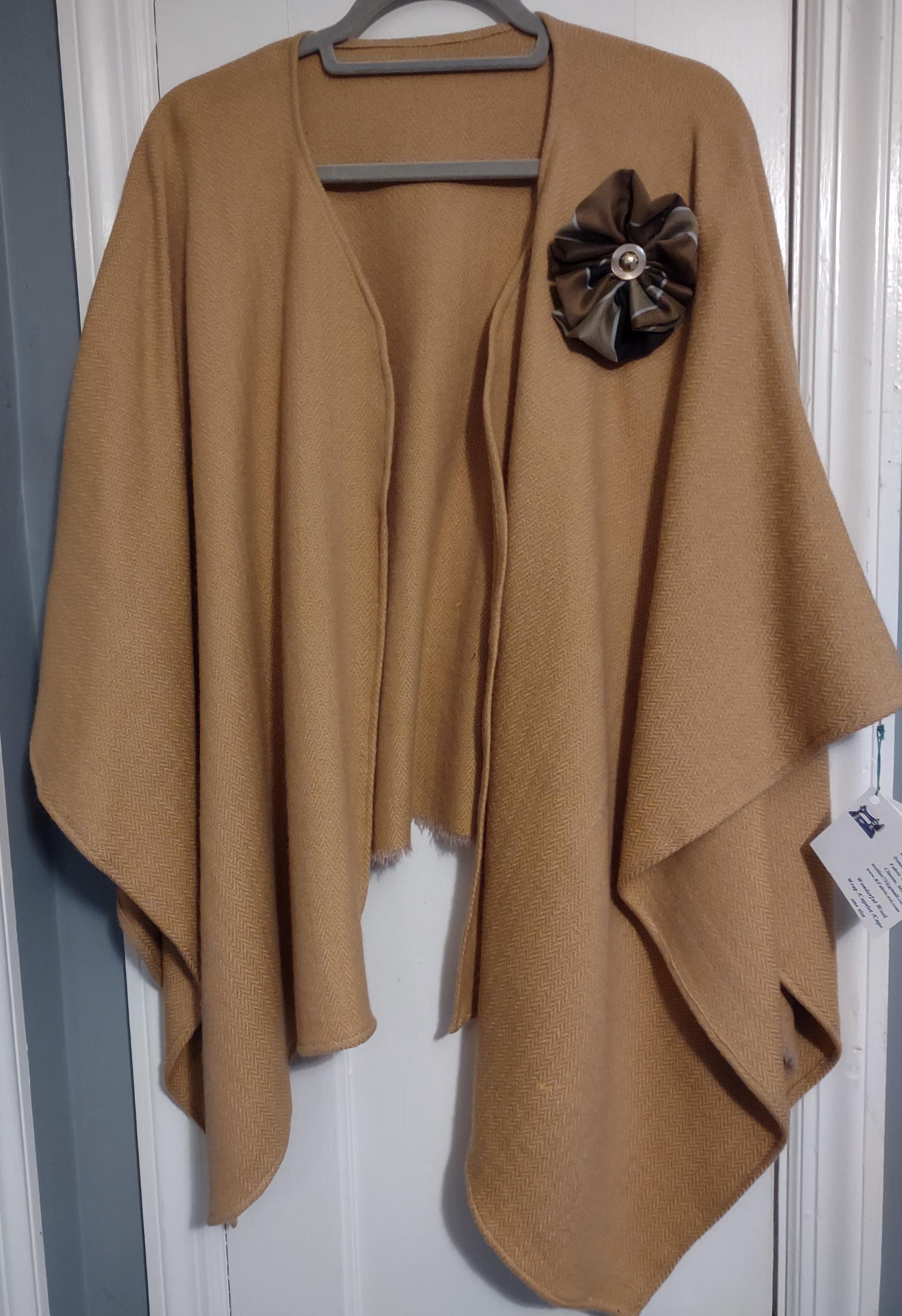 Lovely Gold Wool Wrap in one size is embellished with a fabric pin with button. 100% wool and All Handcrafted