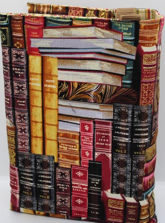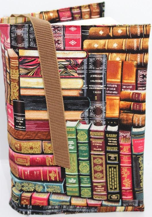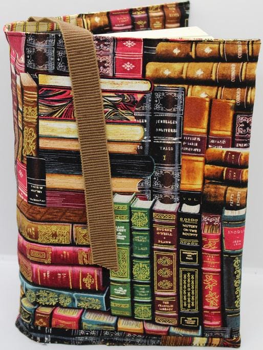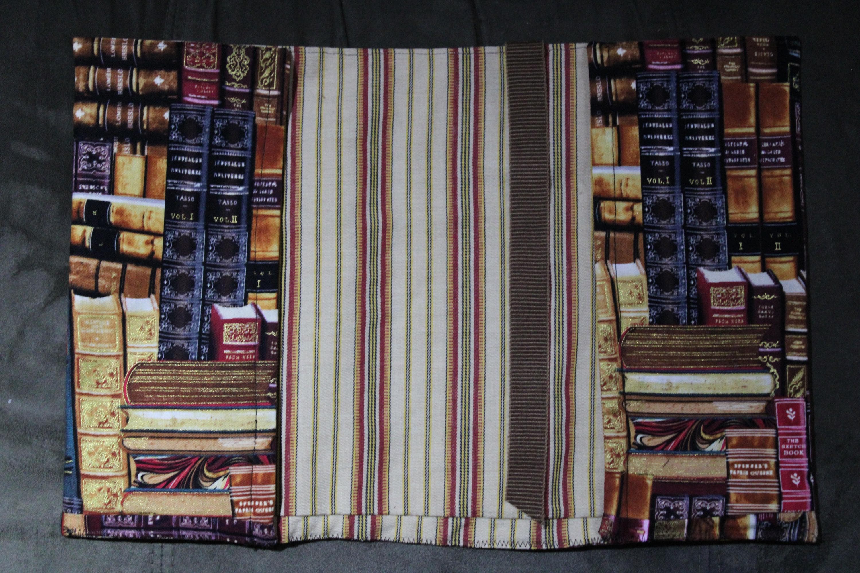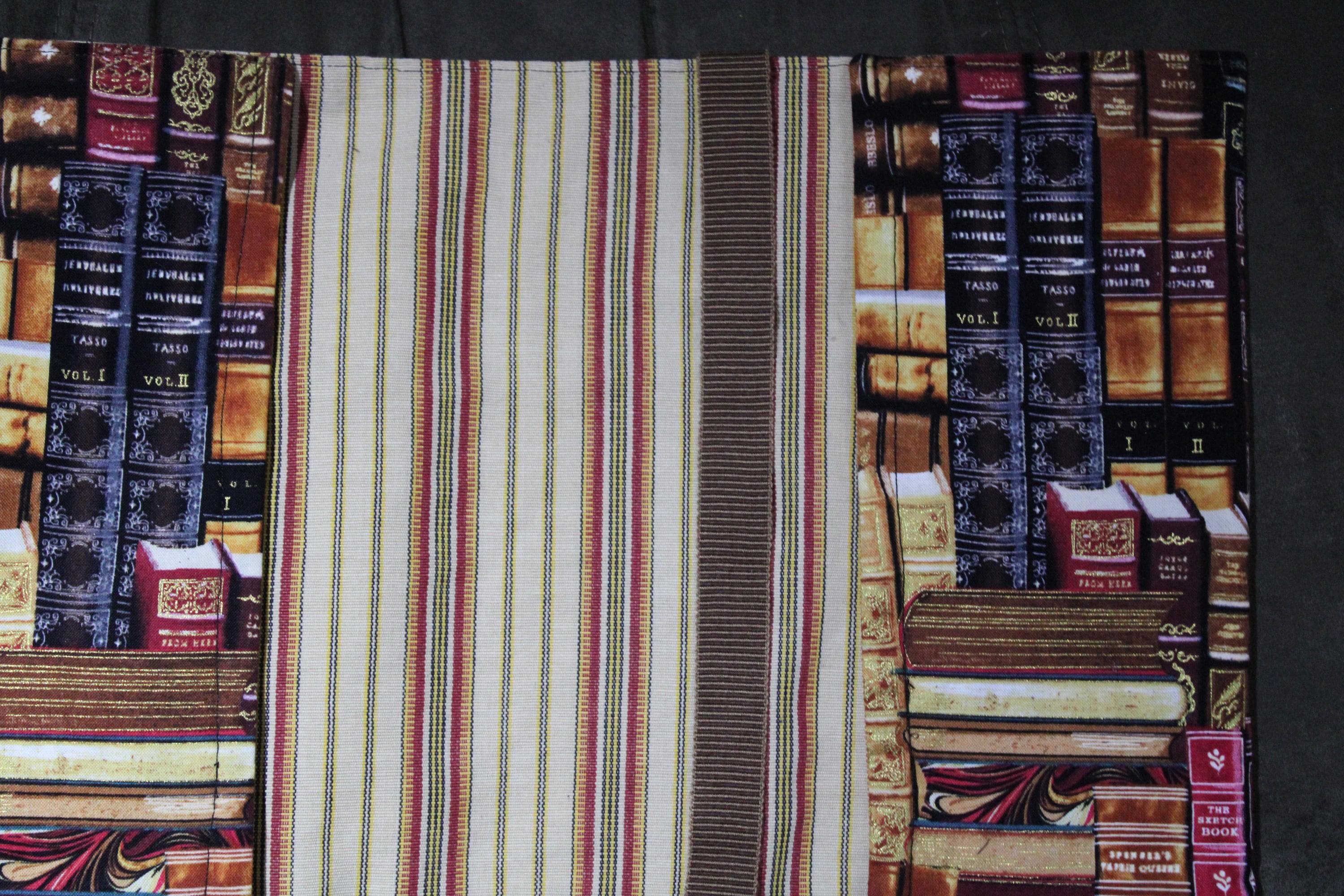 Handcrafted fabric Bookcover is created using a cotton print of brown, green and red classic books. It fits a hardback sized book. There is a brown attached ribbon to use as a bookmark. Protect your favorite book with a cover to have always. It is fully lined with yellow and red striped cotton fabric.