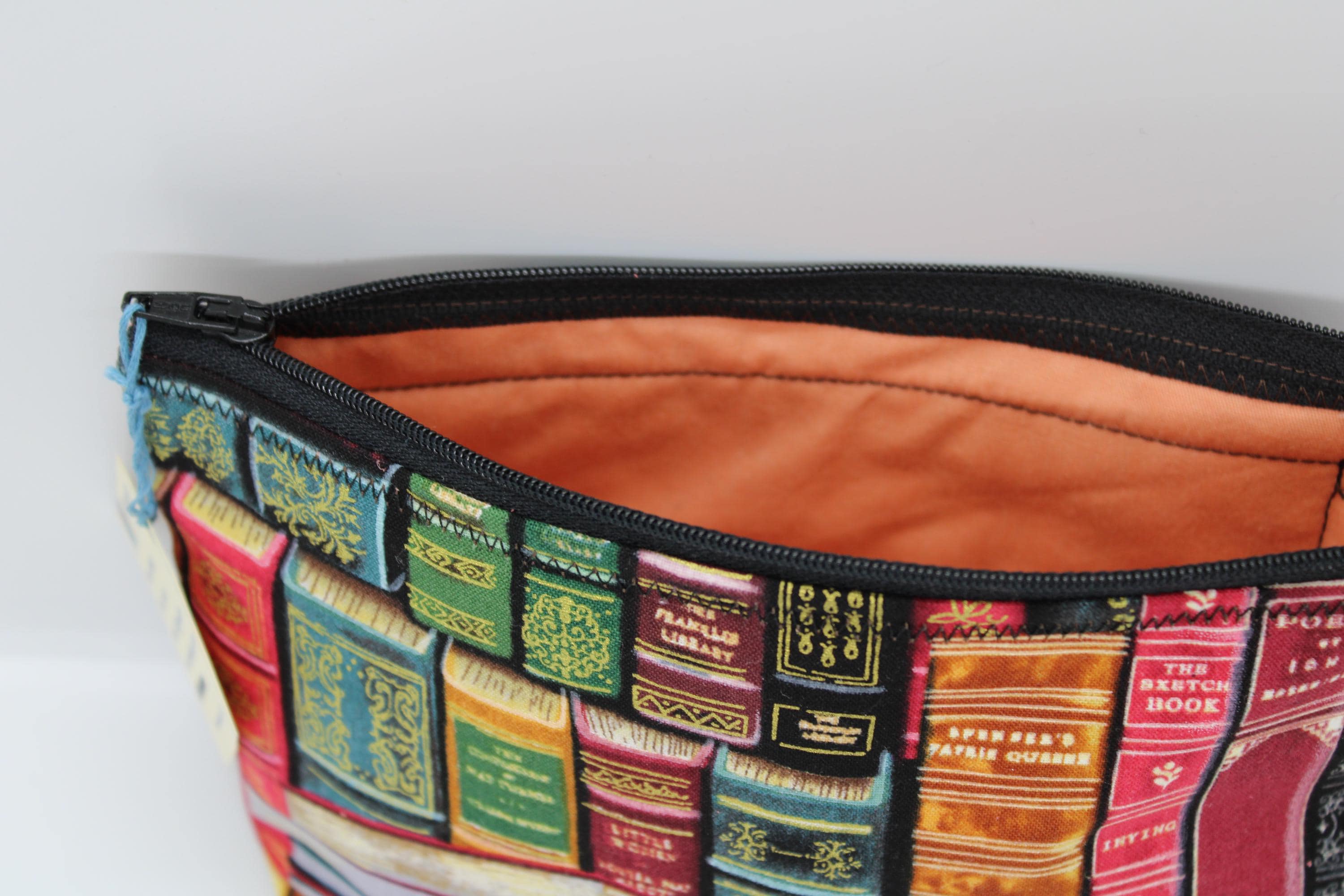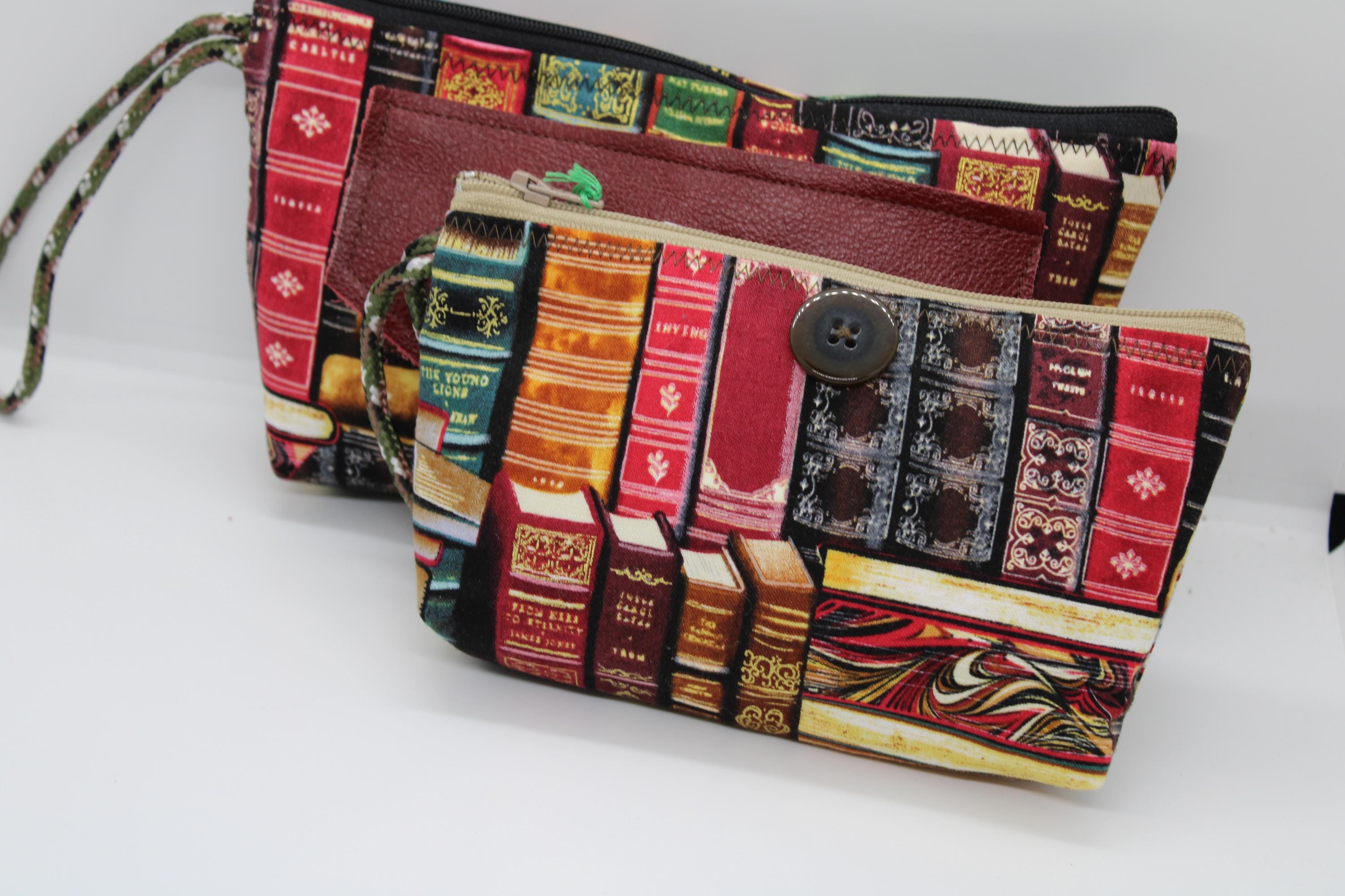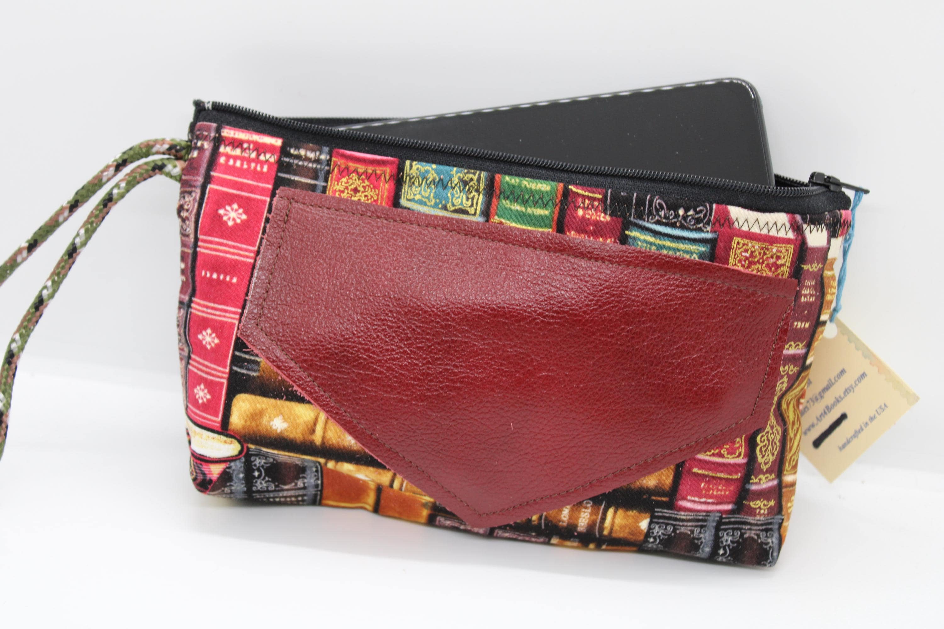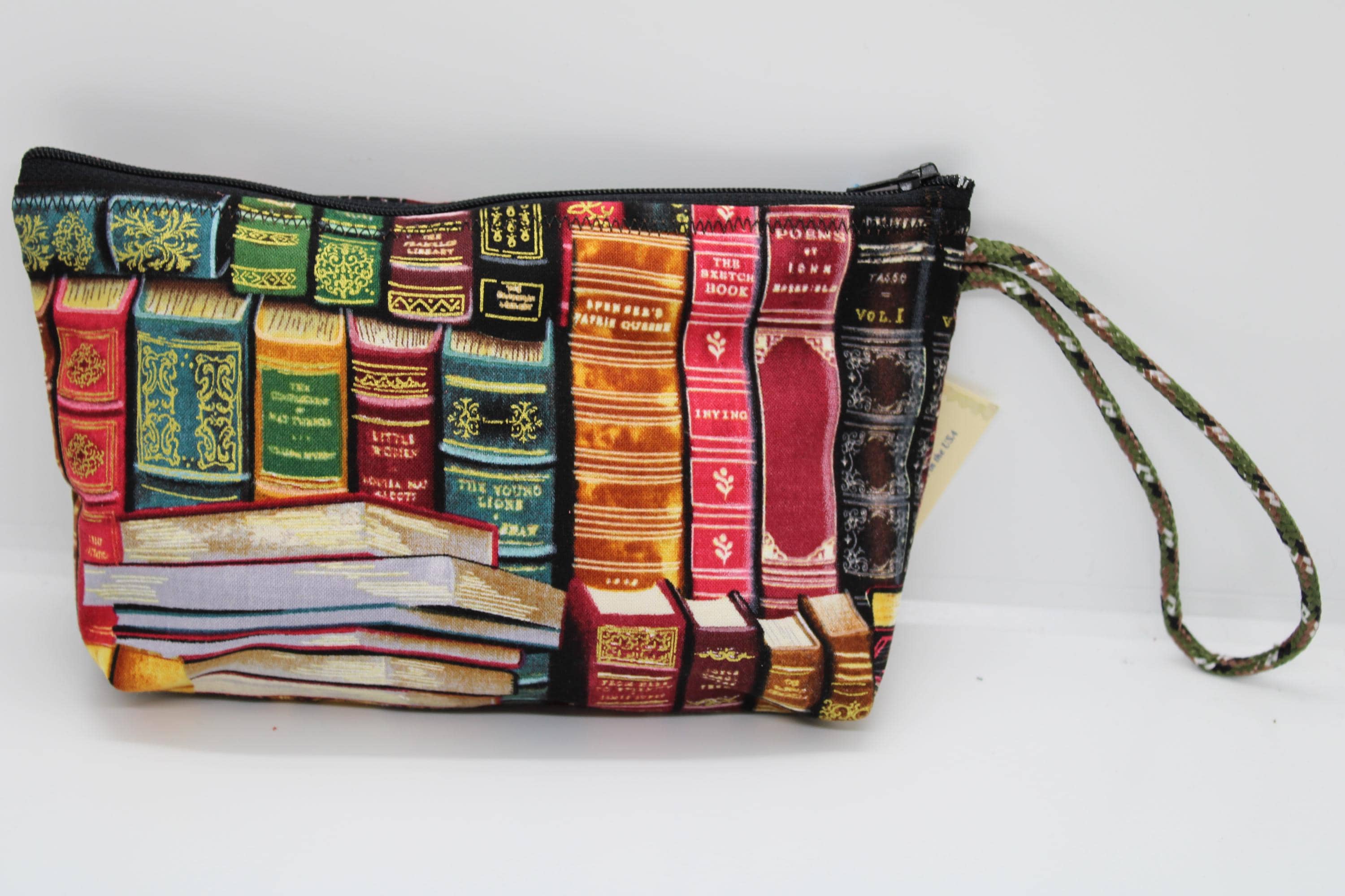 Handcrafted Wrist Purse using Books Print cotton fabric. It can easily hold your smartphone and other items. This bag is fully lined with orange cotton fabric and closes with a black zipper. The wrist strap, of green, brown and white cording can be used to carry this purse, keeping your hands free.