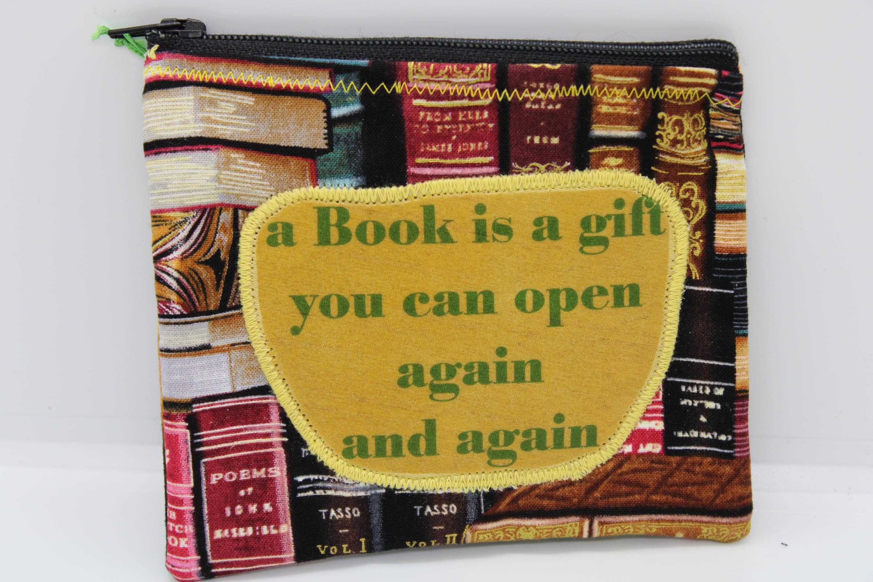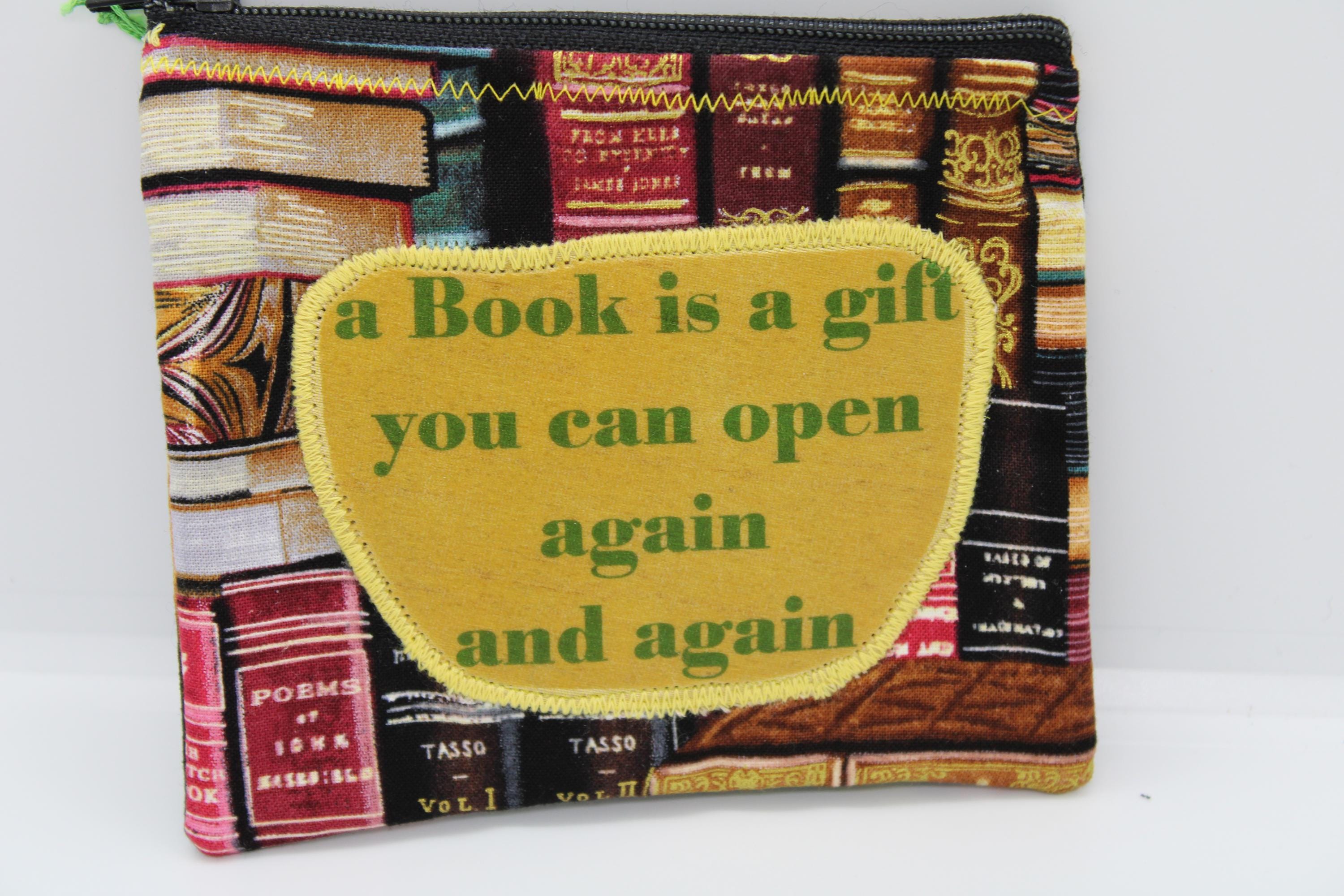Handcrafted books print zippered pouch is imprinted with a quote for all the Book Lovers - "a book is a gift you can open again and again". Colors are brown, red, green, yellow